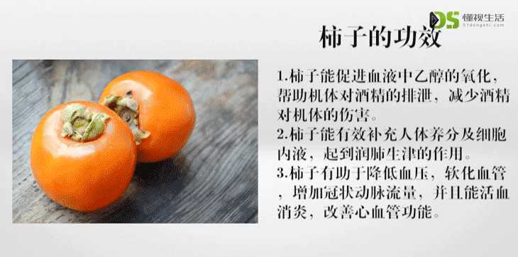 柿子能促進血液中乙醇的氧化,幫助機體對酒精的排泄,減少酒精對人體傷害。柿子還能有效補充人體養分及細胞內液,起到潤肺生津的作用。柿子還有助于降低血壓,軟化血管,增加冠狀動脈流量,并且能活血消炎,改善心血管功能。
