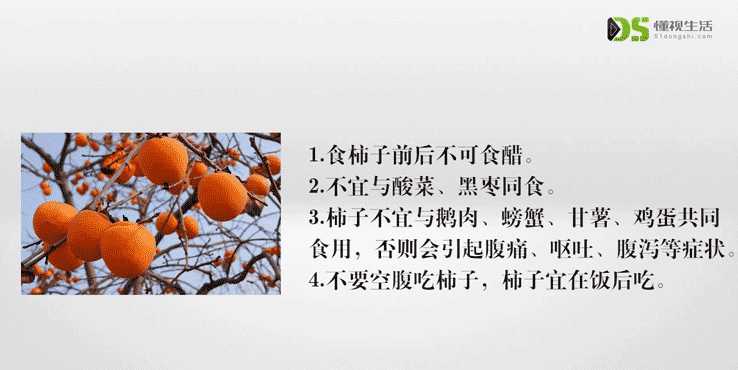 3.柿子不宜與鵝肉、螃蟹、甘薯、雞蛋共同食用,否則會引起腹痛、嘔吐、腹瀉等癥狀。