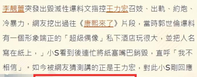 最后一位被牽連的女星并沒有和王力宏傳出緋聞,但疑似知道王力宏的劣跡,她就是小S。之前在某檔節(jié)目中,有人當(dāng)場(chǎng)爆料天王級(jí)別的偶像人物私生活混亂,還寫在紙條上給小S看,小S看到后感到十分震驚,有網(wǎng)友猜測(cè),這位“超級(jí)偶像”,很可能就是王力宏。