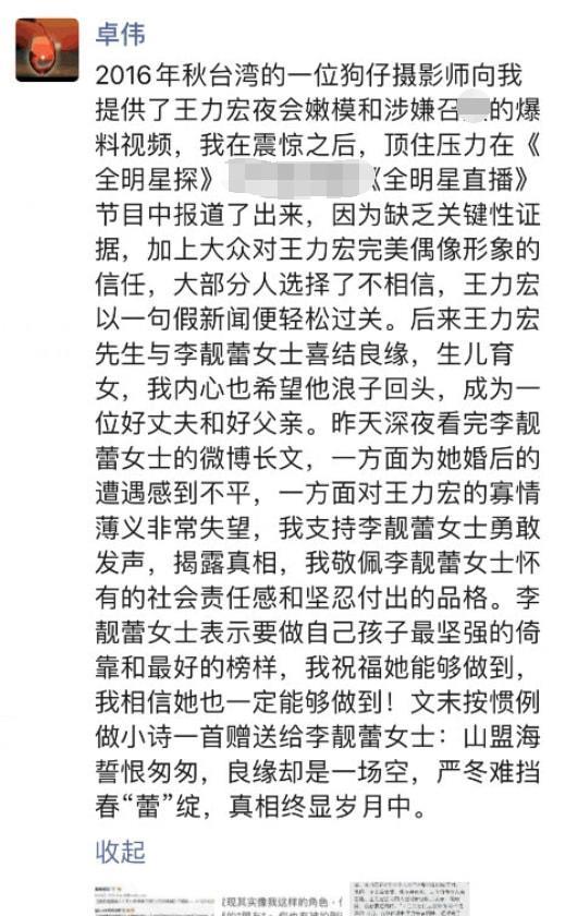 而最開始爆料王力宏夜會(huì)嫩模的卓偉,發(fā)長(zhǎng)文“補(bǔ)刀”,稱王力宏寡情寡義,并佩服李靚蕾敢于揭露這一切。