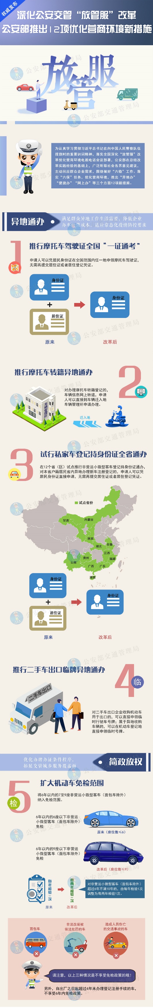 ——試行私家車登記持身份證全省通辦,在12個省(區)試點推行非營運小微型客車登記持身份證通辦,對本省戶籍居民省內異地辦理新車注冊登記的,申請人可以憑居民身份證直接申請,無需再提交居住證或者居住登記憑證。