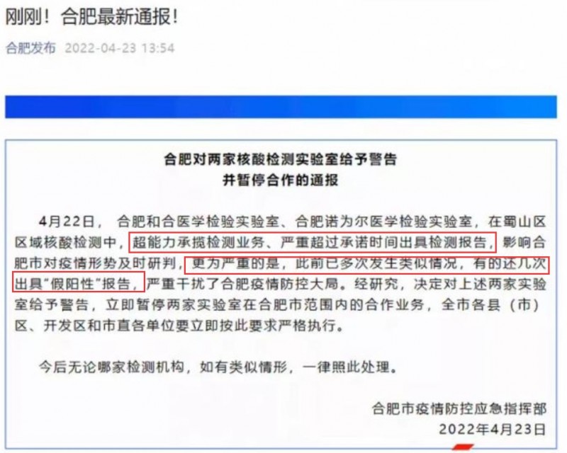 4月23日,合肥疫情官方發布了這樣一則通告,大致的內容是合肥市內有兩家檢測機構,合肥和合醫學檢驗室與諾為爾醫學檢驗室,這兩家機構在承擔合肥蜀山區的核酸檢測任務時,超能力承攬檢測業務,不僅嚴重拖延檢測報告的出具時間,還存在多次出具“假陽性”報告的情況