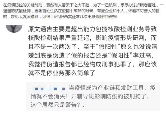 此消息曝光后,立刻引起了很多網友的憤慨,怒罵這兩家機構在大發“國難財”,而更讓人驚訝的是,合肥相關機構在查出兩家公司存在違法出具“假陽性”報告后,竟然只選擇了暫停雙方的合作,而不是直接對其進行處罰