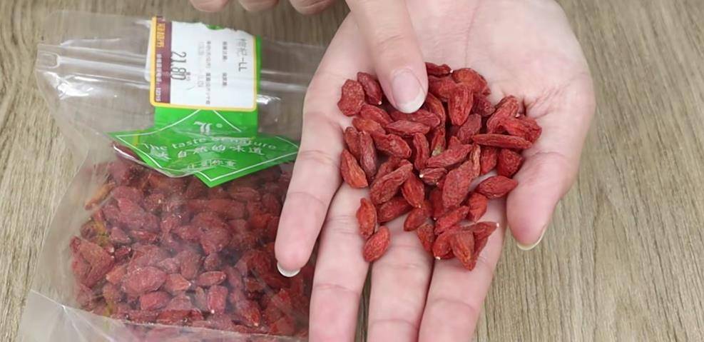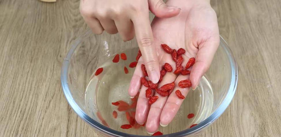 首先把枸杞拿出來一把,然后放在水里面過一遍清水。但是我們都知道枸杞晾曬的時候是有特別多灰塵的臟東西的,所以我們光用清水是洗不干凈的。這時候我們就要在枸杞里面放食用鹽和小蘇打,把它表面的臟東西給清洗出來。