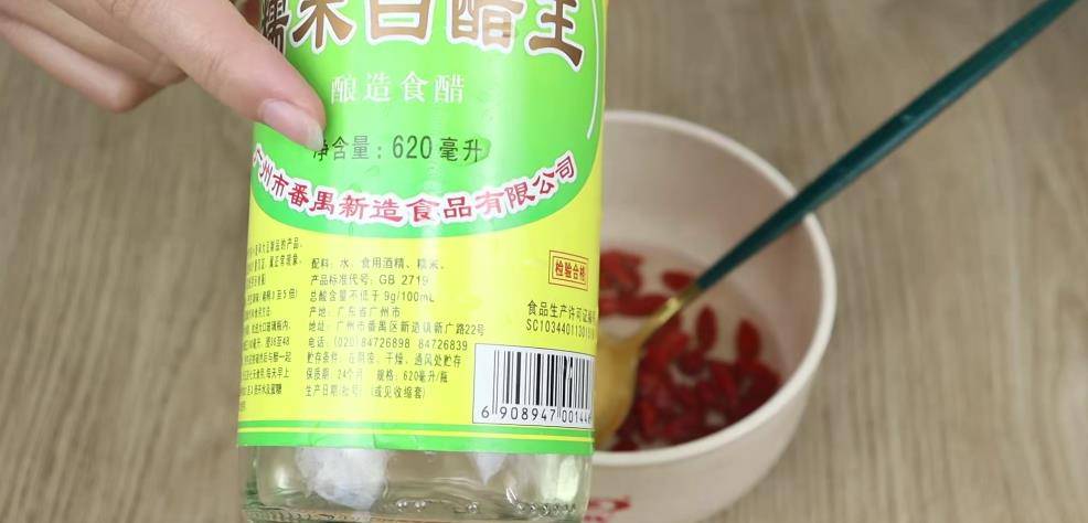 我們的枸杞準備好之后就可以放白醋了,用的白醋也是有一定要求的。大家千萬不要選擇勾兌的白醋,因為勾兌的白醋,喝起來口感就會比較差,而且味道比較難聞。所以說我們在選擇白醋的時候,一定要選擇釀造白醋,這樣喝起來才會更香,口感更好。
