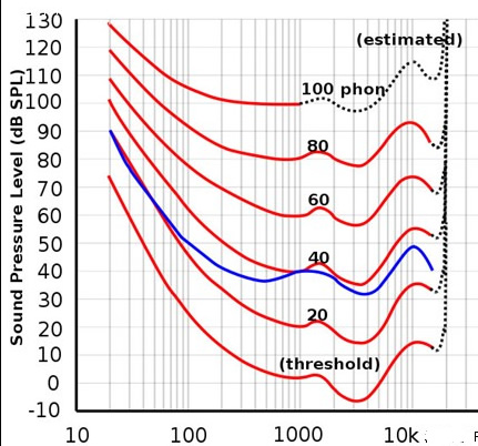 上圖是人耳的等響曲線,Y軸代表聲壓,X軸代表頻率,每一條紅色線都代表著耳朵聽(tīng)上去聲音大小相當(dāng)?shù)穆曇簟:苋菀装l(fā)現(xiàn)這條線并不平行于X軸,如果我們看寫(xiě)著60的那條紅線會(huì)發(fā)現(xiàn)30Hz的100dB的聲音和3000Hz的55dB的聲音聽(tīng)起來(lái)是一樣大的。