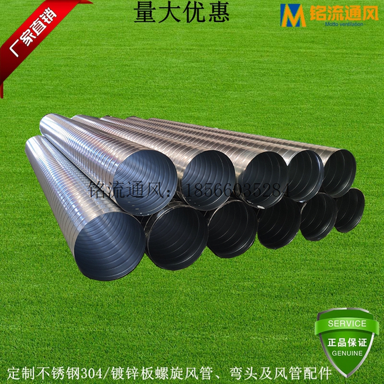 (1) 送風,包括通氣,如送鮮風和排氣,這個范圍很廣,如工廠車間,生產場地空氣,由于有害氣體產生需要排出室外,又需要把室外空氣輸送至室內。這時就要使用流量大而壓力小的空氣輸送管道,螺旋風管就最適用,一般情況下使用鍍鋅鐵管,有腐蝕性及特別潮濕場所使用不銹鋼管。