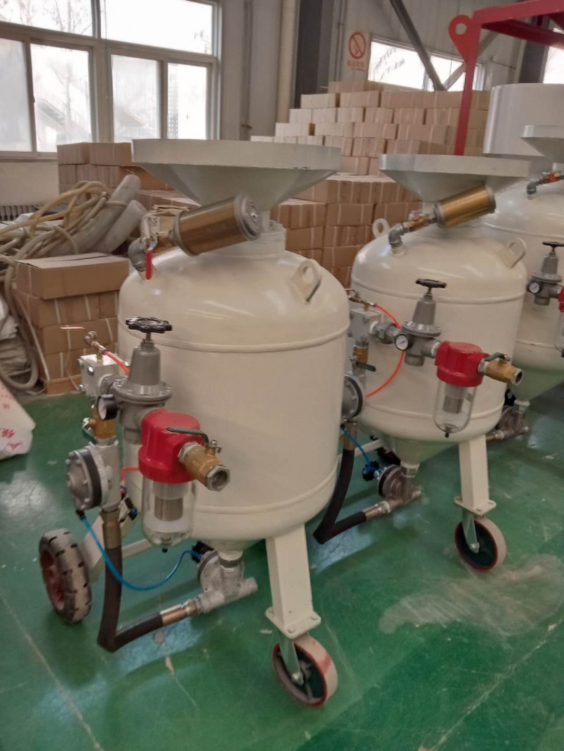 整機工作原理:壓縮空氣經過竹節接頭進入噴砂機壓力罐內,錐形封閉閥頂上,壓力罐密封。壓力管內的磨料流入砂閥,壓縮空氣在砂閥處與磨料混合,經噴砂管從高速噴嘴噴出,對工件進行處理。