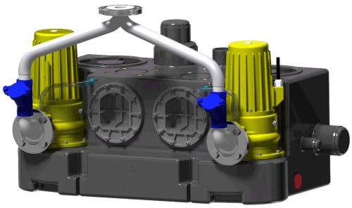 PE塑料箱體,內裝單向閥,Y型管,壓力排水管DN50法蘭片和柔性連接,帶管箍的通氣管連接、平穩的氣動液位控制,緊湊的雙泵提升機