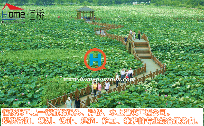 近年來(lái)經(jīng)濟(jì)的發(fā)展帶動(dòng)人類的新需求,浮橋幾乎沒(méi)有被用于渡水工具,而更多的是用于觀光走廊——景觀浮橋。景觀浮橋和普通浮橋有很大的不同,普通浮橋產(chǎn)生浮力的一般是船,將船連在一起然后鋪上木板并打樁固定就成了一座浮橋用于做渡水工具。景觀浮橋比普通浮橋要先進(jìn)精細(xì)的多,景觀浮橋產(chǎn)生浮力的一般是浮箱,浮箱有塑料浮箱和混凝土浮箱之分,浮箱上面鋪的是防腐木面板,為更利于人們游玩觀賞而做的浮橋。