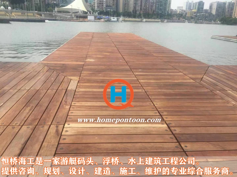 混凝土浮碼頭,整體結構采用鋼筋混凝土一次性澆注工藝,并預埋好水電管道和檢修槽。浮碼頭內槽充填高密度聚苯乙烯泡沫,分段設結構隔艙。因重量極重, 浮橋穩定性超群,具有大氣美觀、耐腐蝕抗凍、搞風浪穩定性好、堅固耐用、維護成本低,能夠適應各種惡劣的自然環境。浮橋組件之間通過一個“減震系統連接固定。