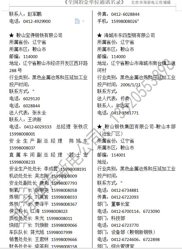 2020全國冶金行業(鋼廠鐵廠鋁廠有色金屬)通訊名錄