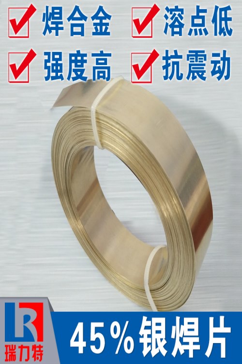 焊不銹鋼用45%銀焊片,焊銅/銅合金用45%銀焊片,焊合金刀具用45%銀焊片的公司牌號是:BAg45C,國標牌號是:BAg45CuZnCd,美標牌號是:BAg-1。是一種含45%銀、15%鋅、24%鎘16%銅的銀基非環保釬焊材料,固液相線:605~620℃,建議最低釬焊溫度:640℃。是銀銅鋅鎘系列綜合性能最好的產品,鋪展性、流動性、填充性極好。適用于有較高表面光潔度、強度及氣密性要求的鐵或鋼件、不銹鋼、硬質合金、銅或銅合金的釬焊,采用火焰釬焊,高頻釬焊、電阻釬焊都行,焊接時需添加助焊劑,如銀焊粉,銀焊膏等,且焊前需對工件進行除油除銹處理,因含有鎘,焊接時注意保持良好通風。廣泛運用于各種黑色金屬、除鋁/鎂外的各有色金屬及合金工件的釬焊,特殊適用于硬質合金刀具釬焊,釬焊面積大的工件。因其溫度低,特別適合有較低溫度要求及多級釬焊中的末級釬焊。性能優于BAg40C。寶貝常規規格有:0.1*40 0.15*40ER 0.2*40ER,圈裝帶材,寬度可訂制裁切。
