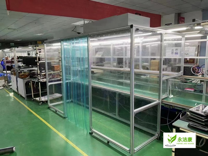 千級潔凈棚:采用工業鋁材(或不銹鋼方通、鐵方通噴塑)作為框架,風機濾網機組(FFU)送風,四周懸掛防靜電垂簾(或鋼化玻璃),其內部凈化級別可達到100~10000級。適用于操作區內局部凈化級別要求高的區域。千級潔凈棚是一種投資少、實施快、性能高、耗能低的局部凈化區設備。