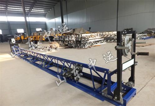 混凝土整平機為框架組合式,設有米單節,可根據工程需要而定,并且節與節之間采用超強度萬向節聯接可調成水平或5°-10°拱型,適合不同的施工要求。動力采用汽油機帶動,偏心塊高速旋轉,帶動機架對混凝土進行振搗。機架兩端裝有離合式絞輪,可以輕松地掌握工作速度。