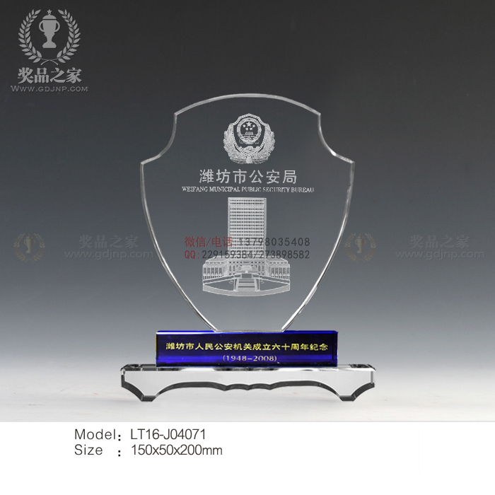 公安局獎牌 警局成立周年紀念品 警察退休紀念品定做廠家水晶獎杯獎牌:是一種高尚純潔的象征,常用于政府和企業頒發的獎品。它晶瑩剔透,閃閃發光,手感細膩,還可以在上面刻字、紋圖案。用的材料水晶---像冰雪一樣的干凈。用它來做獎品給優秀的人是好不過了。 材質:選用K9一級人造水晶 生產工序一共有:開料、壓胚、粗拋光、細拋光、打孔、雕刻、噴砂、粘膠、質檢、包裝