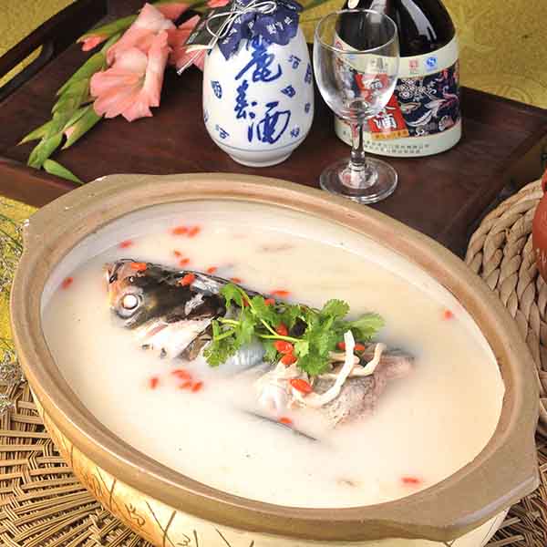 選用特別訂制的江蘇宜興魚頭紫砂砂鍋,將魚頭下鍋煎黃后撈出,放入砂鍋,注入天目湖水,輔以蔥結、生姜、料酒、香醋、香菜、胡椒等,撇除浮油,在火上煨煮數小時,一道白里透紅,細嫩無比,鮮美絕倫的天目湖砂鍋魚頭就可以上桌了。