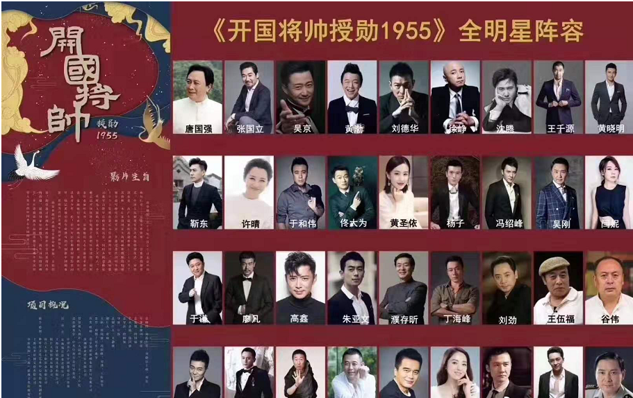 電影《開國將帥授勛1955》,由唐國強主演并執導,馮紹峰、劉勁、侯勇、吳剛、吳京、劉德華、黃渤、徐崢、成龍、黃曉明、佟大為、董璇、閆妮、濮存昕、于謙、于和偉、丁海峰、張譯、張嘉譯、雷佳音等100多位全明星超強陣容聯合主演,對標《我和我的祖國》 ,獻禮2020年國慶檔,直接與出品方簽合同,貓眼可查。