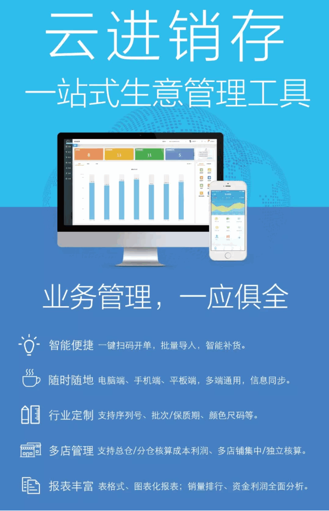 云進銷存:基于SaaS模式,集購、銷、存和應收應付款管理為一體,幫助企業節省成本,提高效率,隨時隨地輕松打理生意,免安裝、免維護、免升級、在線即可試用,手機端開單、查庫存、查報表,經營狀況隨時掌握。