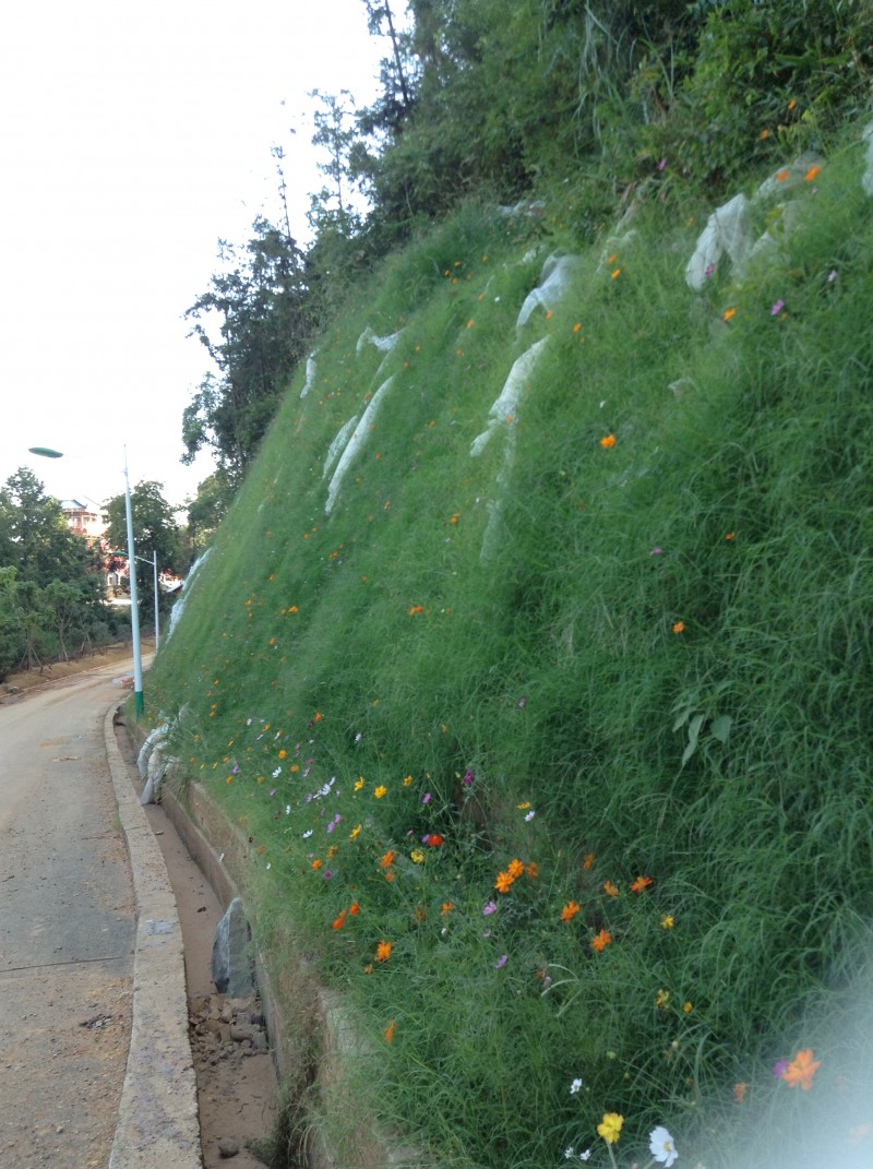 自河南景繡繪遠(yuǎn)生態(tài)科技有限公司創(chuàng)建以來,在“邊坡綠化裝備與技術(shù)研究中心”的強(qiáng)力推動下,不斷推出新的施工技術(shù)、研發(fā)出新的施工用原材料。景繡生態(tài)秉承恒睿團(tuán)隊認(rèn)真、細(xì)致、一步一檢驗的生產(chǎn)理念,依據(jù)張成梁研究員“師法自然的理念效仿蕨類苔癬防雨水沖刷的自然現(xiàn)象。先后創(chuàng)立了“高陡坡創(chuàng)面纖維骨架修復(fù)技術(shù)”、景繡噴播纖維有機(jī)菌肥、防雨水沖刷的AB型高分子材料、景繡仿苔蘚表層纖維,運(yùn)用多項專利技術(shù)使得我們施工后的坡面形成束狀多孔結(jié)構(gòu),提高防雨水沖刷能力,同時土壤形成蜂窩狀結(jié)構(gòu),增加坡面保水性,使坡面植被能順利吸收自然降水并把雨水有效儲存,從而將裸露坡面恢復(fù)成原始自然生態(tài)叢林,一舉打破國內(nèi)邊坡綠化行業(yè)“一年綠,兩年荒,三年死光光”的整體現(xiàn)狀。
