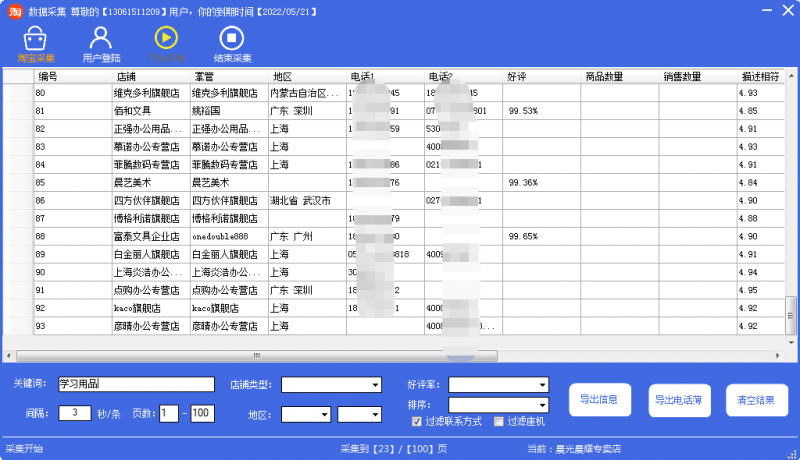 淘寶商家電話采集系統可以任意抓取不同店鋪中的數據。軟件能夠根據用戶設定的采集條件(關鍵字、省市、店鋪級別等),進行相匹配的數據一鍵采集,讓您更精準、更快速的找到理想中的數據!通過本工具能夠直接獲取各種淘寶賣家的信息。