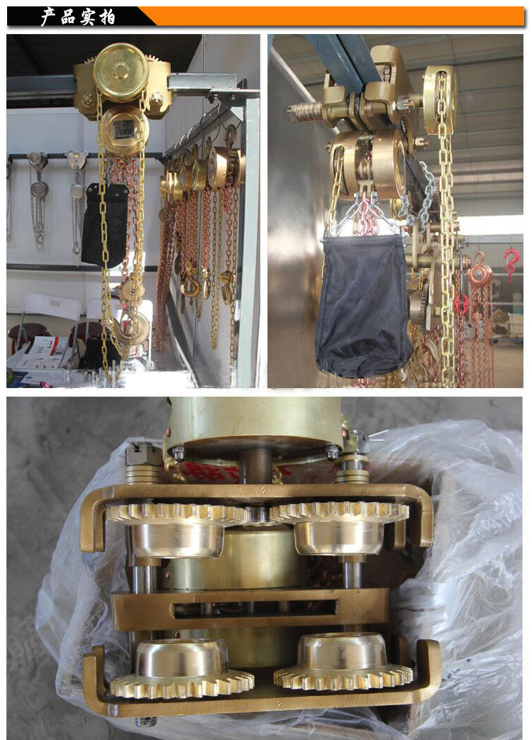 防爆手拉葫蘆,防爆滑動小車,防爆千斤頂防爆手拉葫蘆:本發明以鋁青銅、鈹青銅作為毛坯,手拉葫蘆外殼采用銅合金材料。防爆手拉葫蘆受力摩擦部位包括構成手拉葫蘆的起重輪、手鏈輪、墻板、掛鉤、齒輪、齒輪軸采用鋁青銅、鈹青銅合金材料。防爆手拉葫蘆適用于石油、化工、煉油、采氣、油品運輸、礦山作業等易燃易爆氣體場所。