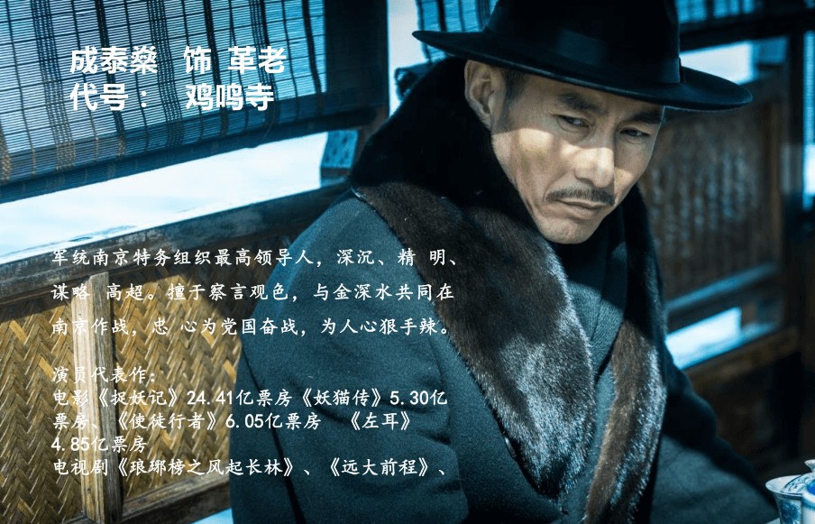 軍 統(tǒng)南 京 特務(wù) 組 織 最 高領(lǐng) 導(dǎo) 人 , 深 沉 、 精 明 、謀略 高超。 擅 于察 言觀 色 ,與 金 深 水 共同 在南京 作 戰(zhàn) , 忠 心 為 黨 國(guó) 奮 戰(zhàn) , 為人 心 狠手 辣 。