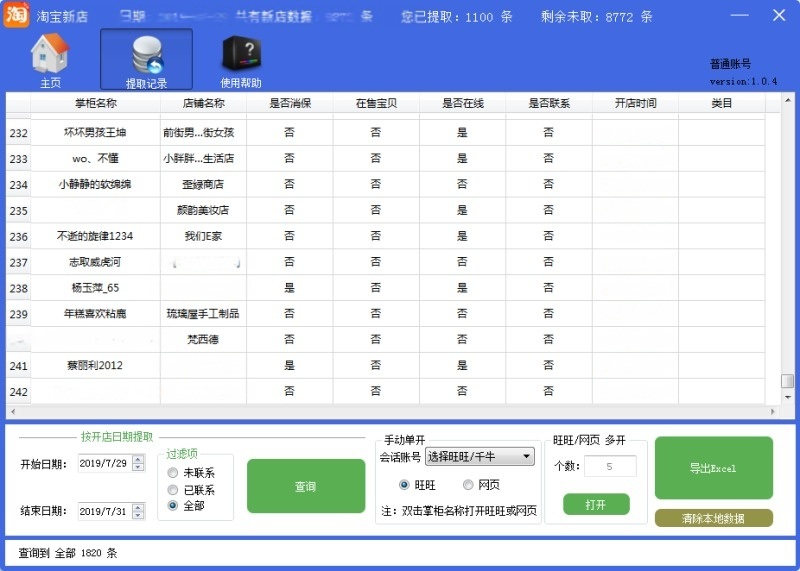淘寶新店提取器可以查詢當(dāng)天開店的零信譽(yù)店鋪的賣家旺旺,可以設(shè)置的條件主要為 賣家信譽(yù),賣家店鋪有無商品,是否加入消保,賣家旺旺是否在線等條件對(duì)采集的旺旺進(jìn)行詳細(xì)的篩選。操作簡單,可以查詢到當(dāng)天以及一個(gè)月內(nèi)新開店鋪的數(shù)據(jù),賣家旺旺。進(jìn)行查詢到開店的店鋪,非常的方便和強(qiáng)大, 我們這邊淘寶新注冊(cè)店鋪查詢軟件采用了多線程開發(fā),速度明顯優(yōu)于網(wǎng)上同類軟件,這塊軟件方面,查詢和提取的速度,直接關(guān)系到使用者的效率。實(shí)時(shí)采集 時(shí)時(shí)抓取,安全穩(wěn)定。