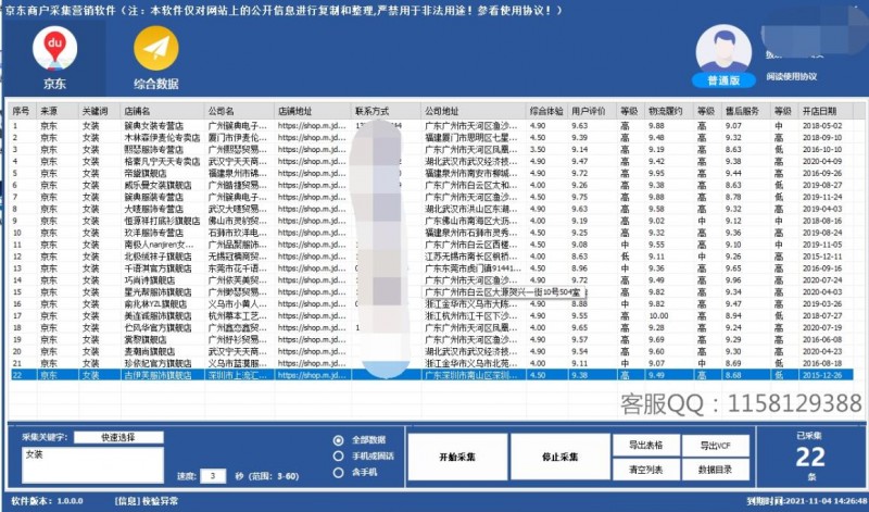 2、軟件可以采集到店鋪名稱、店鋪鏈接、聯(lián)系電話、各項評價數(shù)等。