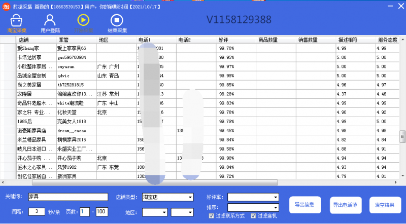 2、軟件可以采集到店鋪名稱、旺旺名、電話號碼、手機號碼、銷量、評價數、好評率等。