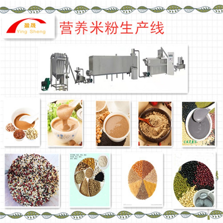 盈盛機(jī)械生產(chǎn)的營(yíng)養(yǎng)米粉生產(chǎn)線以谷物為主要原料(玉米、大米、小米、小麥、燕麥、山藥、魔芋等,敷一天假各種豆類如黑豆、紅豆、薏米、黑芝麻等),配以以蔬菜、水果、蛋類、肉類等選擇性配料,加入鈣、磷、鐵等礦物質(zhì)及維生素等通過(guò)擠壓膨化工藝使谷物淀粉糊化,蛋白質(zhì)熟化,加工成一種食用方便、口味濃香、營(yíng)養(yǎng)的新時(shí)代營(yíng)養(yǎng)補(bǔ)充食品。統(tǒng)稱稱為營(yíng)養(yǎng)粉,營(yíng)養(yǎng)粉根據(jù)使用人群可分為嬰幼兒營(yíng)養(yǎng)粉,青壯年能量營(yíng)養(yǎng)粉,中年保健營(yíng)養(yǎng)粉,中老年藥物保健型營(yíng)養(yǎng)粉。