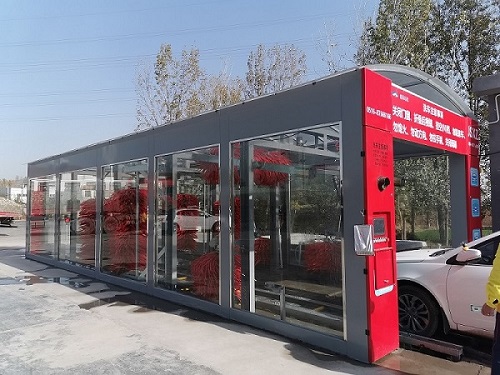 當車輛被輸送機送入洗車房后,首先由圓柱式高壓水刀對車體表面進行擺動式高壓力沖洗,清除車表面的浮塵沙粒,大程度保護汽車漆面;再經噴淋發泡清洗液和九組洗滌刷滾(S1100十一組貓砂)對車輛表面進行清洗;高壓風干,使車輛表面光亮如新。
