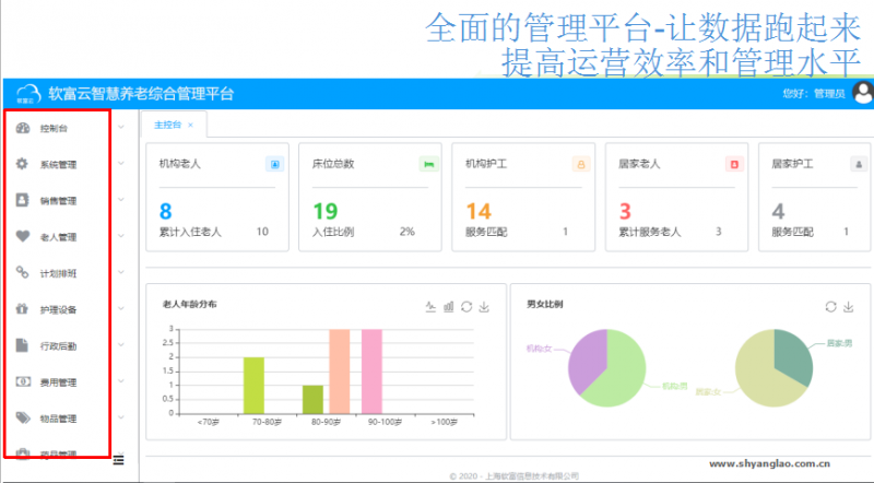 軟富云智慧養(yǎng)老提供智慧養(yǎng)老管理平臺(tái)和智能養(yǎng)老設(shè)備。平臺(tái)整合有包含基礎(chǔ)資料、庫存管理、老人管理、排班管理、設(shè)備管理、費(fèi)用管理、醫(yī)療管理、機(jī)構(gòu)內(nèi)管理等功能模塊。平臺(tái)包括從老人成為潛在客戶開始到老人離院各個(gè)環(huán)節(jié),通過明確的職能安排,合理進(jìn)行資源配置,有效節(jié)約成本,提升效率。