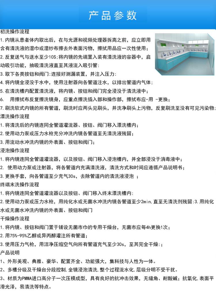 內(nèi)鏡一體化清洗工作站是嚴(yán)格按照衛(wèi)生部《內(nèi)鏡清洗消毒技術(shù)規(guī)范( 2004年版)》的要求精心設(shè)計(jì),產(chǎn)品本著人性化與自動(dòng)化理念,有引進(jìn)國(guó)內(nèi)外設(shè)備和設(shè)計(jì)理念,人性化關(guān)懷更強(qiáng),充分體現(xiàn)了人機(jī)的結(jié)合。內(nèi)窺鏡清洗工作站規(guī)范化的生產(chǎn)程序包括:選材、配料、模具、成型,打磨、加固、拼裝破壞性實(shí)驗(yàn)檢測(cè)、裝飾裝修等:產(chǎn)品力求精益求精,到客戶滿意為止。多種組合方式,靈活方便,滿足不同醫(yī)院房間的需求,不同診療規(guī)模,不同的洗消習(xí)慣等,為每一家醫(yī)院和科室量身打造,普通、標(biāo)準(zhǔn)、豪華由您掌控 !您的滿意就是我們的追求!
