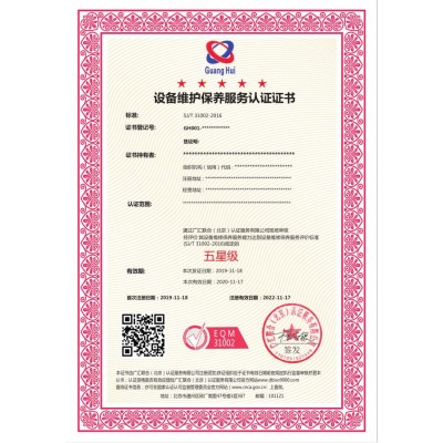 設備維護保養服務認證是依據SJ/T 31002-2016 企業設備維修保養通則而實施的認證?!禨J/T 31002-2016企業設備維護保養通則》及《設備維護保養服務認證實施規則》進行評價。SJ/T 31002-2016標準適用于電子行業企業和實業單位的通用機械設備、專用設備、動力設備、電氣設備,其他設備也可參照執行。 組織可申請設備維護保養服務認證,以此作為組織已滿足市場對于企業設備維護保養服務要求的證明設備維修保養服務認證是依據SJ/T 31002-2016 企業設備維修保養通則而實施的認證?!禨J/T 31002-2016 企業設備維護保養通則》及《設備維護保養服務認證 實施規則》進行評價。SJ/T 31002-2016標準適用于電子行業企業和實業單位的通用機械設備、專用設備、動力設備、電氣設備,其他設備也可參照執行。