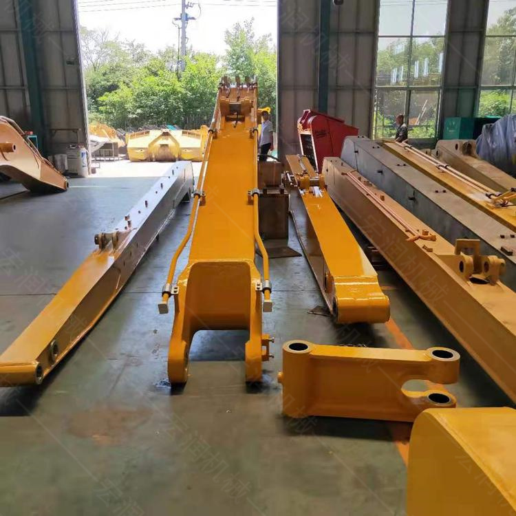 加長臂分為二段式、三段式、四段式,二段式主要適用于土砂、混凝土等建筑搬運、高速公路坡面修整及河道疏通清淤及建筑基礎、河道、深溝等土石方挖掘作業等;三段式、四段式主要適用于高層建筑樓體的拆解等作業等。主要的是:要根據加長臂重量的需要,適當加重機器后部配重塊的配重重量,以保持前后平衡。避免挖掘機工作中出現事故