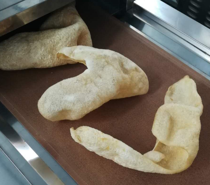 微波膨化焙烤的特點——能量轉換效率高,加熱速度快。微波爐本身不發熱,而是微波能量穿透物料,使物料內極性分子相互摩擦而產生內部熱量。使被加工物料內部的液體瞬間升溫汽化、增壓膨脹;并依靠氣體的膨脹力使組分中高分子物質結構變性,而成為具有網狀組織結構特征、定型的多微孔狀物質。為了尋求肉食加工副產品——肉皮的有效利用,增加肉食品種花樣,提高肉皮風味和適口性,用新鮮豬皮作了微波設備膨化試驗,然后做成各種菜肴,效果良好,為進一步開拓肉食副產品——肉皮膨化的利用打開了一個新局面。