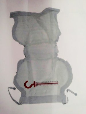 2、打開(kāi)一次性產(chǎn)婦出血計(jì)量墊巾,穿戴至產(chǎn)婦陰道部位,將兩側(cè)橡皮筋條扣上。