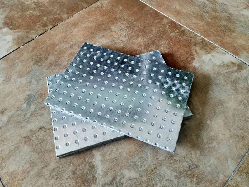 抗爆板是采用三明治結構組成,表層結構為0.5mm鍍鋅鋼板,夾層為纖維水泥板。表層鋼板是20mm間距,全部打出5mm的圓孔,孔內鋼板為鋸齒狀,深入水泥層,用高壓將三者緊密結合,水泥凝固時即成為兼具鋼板與水泥功能的抗爆板。