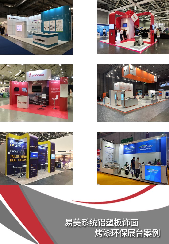 其一為比利時(shí)鋁合金框架系統(tǒng)----BEMATRIX.BEMATRIX是唯一繼承發(fā)揚(yáng)大的框架結(jié)構(gòu)的展覽系統(tǒng),以手?jǐn)Q方式就可以快速搭建起主體框架結(jié)構(gòu),外 飾面主要采用以鋁塑板飾面的搭建方案,達(dá)到木制烤漆效果的環(huán)保搭建方案。