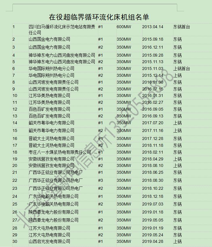 內容包含:電廠名稱、郵編、地址、各科室(生技科、物資部、運行部、設備部)負責人姓名和電話、裝機容量、投產時間、三大主機生產商等詳細信息。