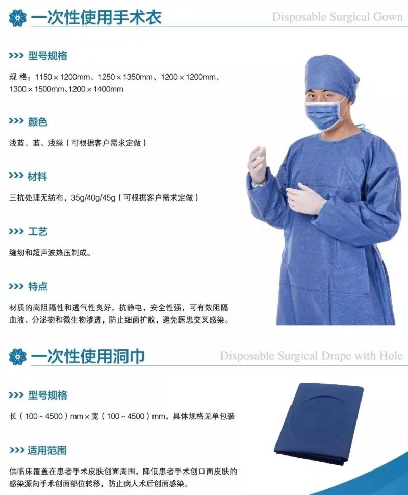 產品特點:材質的高阻隔性和透氣性好,抗靜電,安全性強,可有效阻隔血液分泌物和偉生物滲透,防止細菌擴散,避免醫患交叉感染。