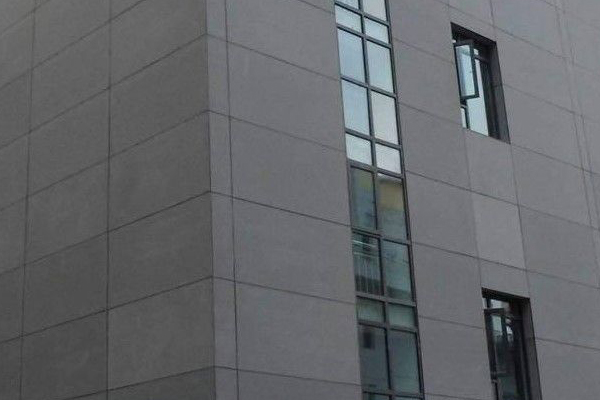 2、纖維水泥板準(zhǔn)備:首先用比色法對纖維水泥板的顏色進(jìn)行挑選分類;整個中庭部位纖維水泥板的顏色應(yīng)一致,并根據(jù)設(shè)計尺寸和圖紙要求,將干掛纖維水泥板配套鋁掛件安裝在背面,按照每塊板材背面6個鋁掛件。為保證鋁掛件位置準(zhǔn)確垂直,事先在纖維水泥板背面按照橫龍骨豎向間距600mm及纖維水泥板長度等分尺寸彈十字交叉線,在十字交叉點上固定配套鋁扣件,鋁掛件采用10mm長,4mm粗不銹鋼螺釘固定在纖維水泥板背面,鋁扣件安裝完畢后需要復(fù)核其水平及垂直度。
