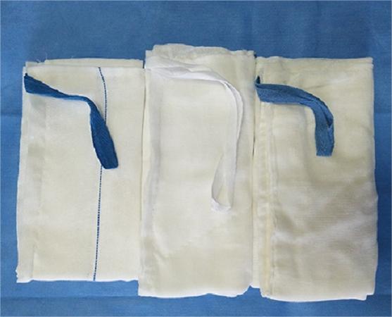 結構及組成:I型:由脫脂紗布加工制成;II型由夾有X射線可探測組件的脫脂紗布塊加工制成,腳步均可縫制一根腹巾帶。