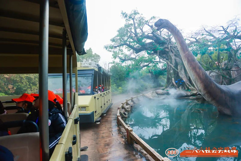 該場地仿照了侏羅紀時期熱帶雨林風格建造,給大家營造了身臨其境的環境。大家s先坐上專屬列車,來到雨林深處,隨后排好隊伍開始徒步。