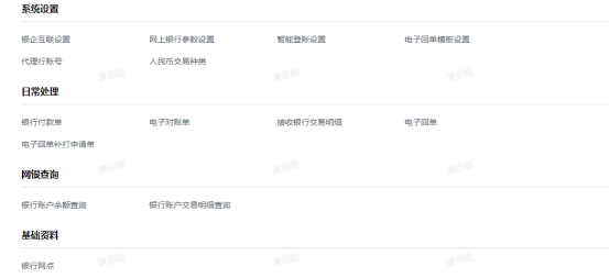 網(wǎng)上銀行模塊把業(yè)務(wù)模塊與EAS銀企平臺(tái)進(jìn)行連接,不需要與各家銀行直接對(duì)接,企業(yè)通出納資金業(yè)務(wù)系統(tǒng)可直接對(duì)其銀行賬戶和資金進(jìn)行管理和調(diào)動(dòng),完成查詢、轉(zhuǎn)賬、代發(fā)和資金歸集等業(yè)務(wù)操作。本系統(tǒng)主要包含以下應(yīng)用: