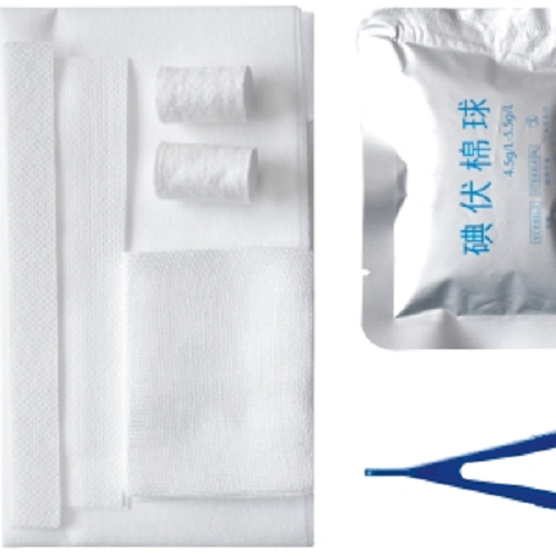 A型由基本組件醫用脫脂紗布塊、一次性使用醫用橡膠檢查手套和可選組件一次性使用治療巾、醫用保護套、醫用無菌敷貼、透氣膠帶、醫用酒精棉球、醫用碘伏棉球、醫用酒精棉簽、醫用碘伏棉簽、醫用輸液貼、醫用棉球、醫用棉簽、一次性使用孔巾、一次性醫用墊、一次性使用配藥用注射器、檢查手套、一次性使用敷料鑷、試管、一次性使用滅菌橡膠外科手套、一次性使用無菌手術膜、一次性使用口罩、帽、托盤、醫用鉗、紗布繃帶、包布組成;