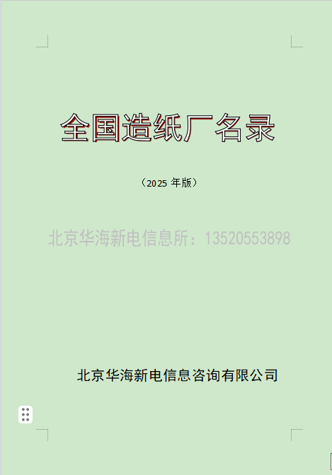 編輯說明 本書由從事信息收集工作的北京華海新電信息咨詢 有限公司核實整理,通過參考工商、統計、行業協會等有關權威部門的相關資料等多種渠道,再經由我公司信息部人員認真核對、整理、更新、添加,屬實時更新,但由于企業 信息瞬息萬變,在本公司信息員逐一核實期間和出版期間,會 有一定的人員變動或電話更改,致使本書中所列企業信息的準 確率不能達到 100%,敬請廣大用戶給予諒解和批評指正,歡迎提供反饋信息,以便我們及時糾正。 造紙行業屬重污染行業,經過10多年的整合,數量已經不多,規模比較大,我們整理了5000家左右的造紙企業。生產品種:瓦楞原紙,白紙板,廢紙漿,溶解漿,特種紙,印刷紙,生活用紙,南金紙,宣紙,薄頁紙,紙箱,紙制品,資料包含:企業名稱、企業地址、企業法人、企業聯系人、聯系方式、傳真、企業經營范圍 歡迎提出您的寶貴意見!