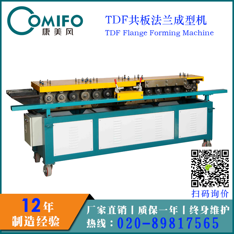 TDF法蘭適合于截面面積不大的通風管道,密封性好,成本低。配備16對成型輥輪,2個成型工位。法蘭高度有20mm,34mm和40mm三種。標準工位用于制作TDF共板法蘭,輔助工位用于制作法蘭卡碼(法蘭夾)。即一邊成型法蘭,一邊成型卡碼,達到一機雙能。外形精致美觀,可帶到施工現(xiàn)場使用,尤其適合亞洲、澳洲和美洲市場。與康美風卡碼刻痕機和卡碼扳手配合使用,無需剪切成型后的卡碼,減少卡碼變形,使用康美風卡碼扳手可加快卡碼安裝速度。