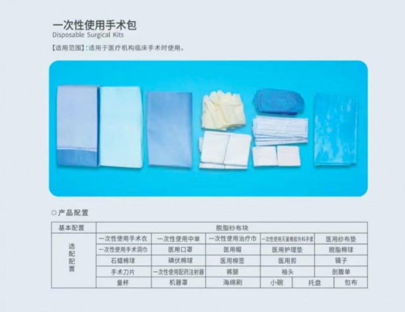 本產品由基本配置脫脂紗布塊和選配配置一次性使用手術衣,一次性使用中單、一次性使用滅菌橡膠外科手套、醫用紗布墊,一次性使用治療巾、醫用ロ罩、醫用帽、醫用護理墊、一次性手術中、格球、醫用。劃球。袖頭、剖腹單、量杯、機器罩、海刷、小碗、托盤、包布組成產品應無菌。經環氧乙烷滅菌后,環氧乙烷殘留量應不大于10